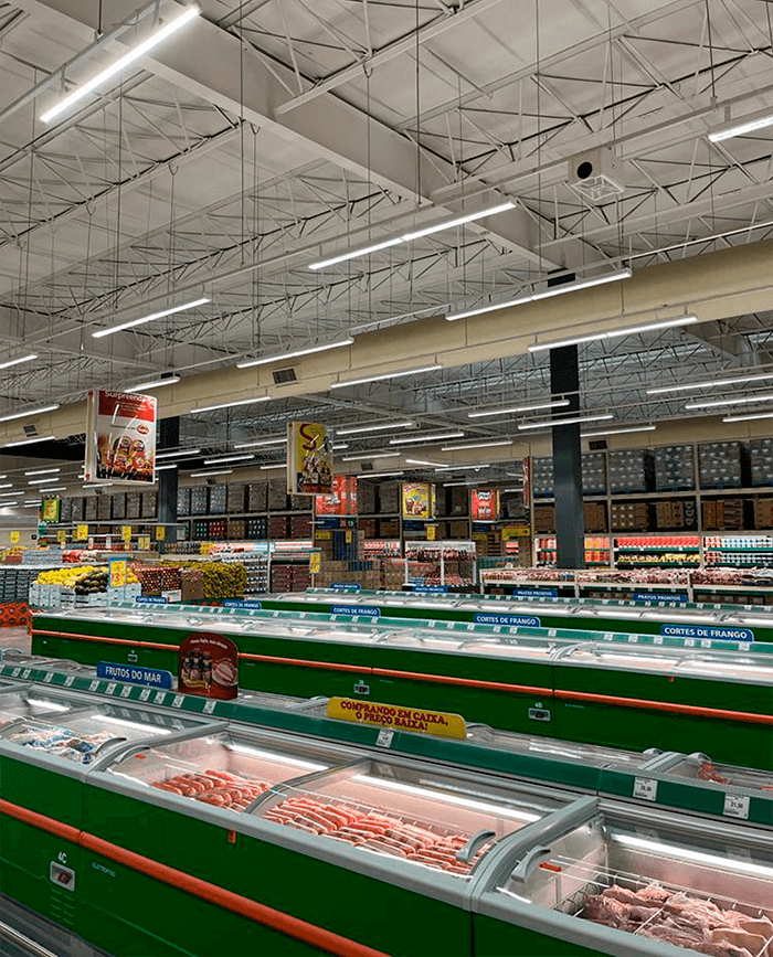 Instalações elétrica, hidráulica e incêndio. Reforma para adequação a novo layout (virada de bandeira de BIG para Atacadão). Salão de vendas, depósito, mezanino, câmara fria, banheiro de clientes, estacionamento térreo, estacionamento subsolo, estacionamento descoberto, docas, administrativo.